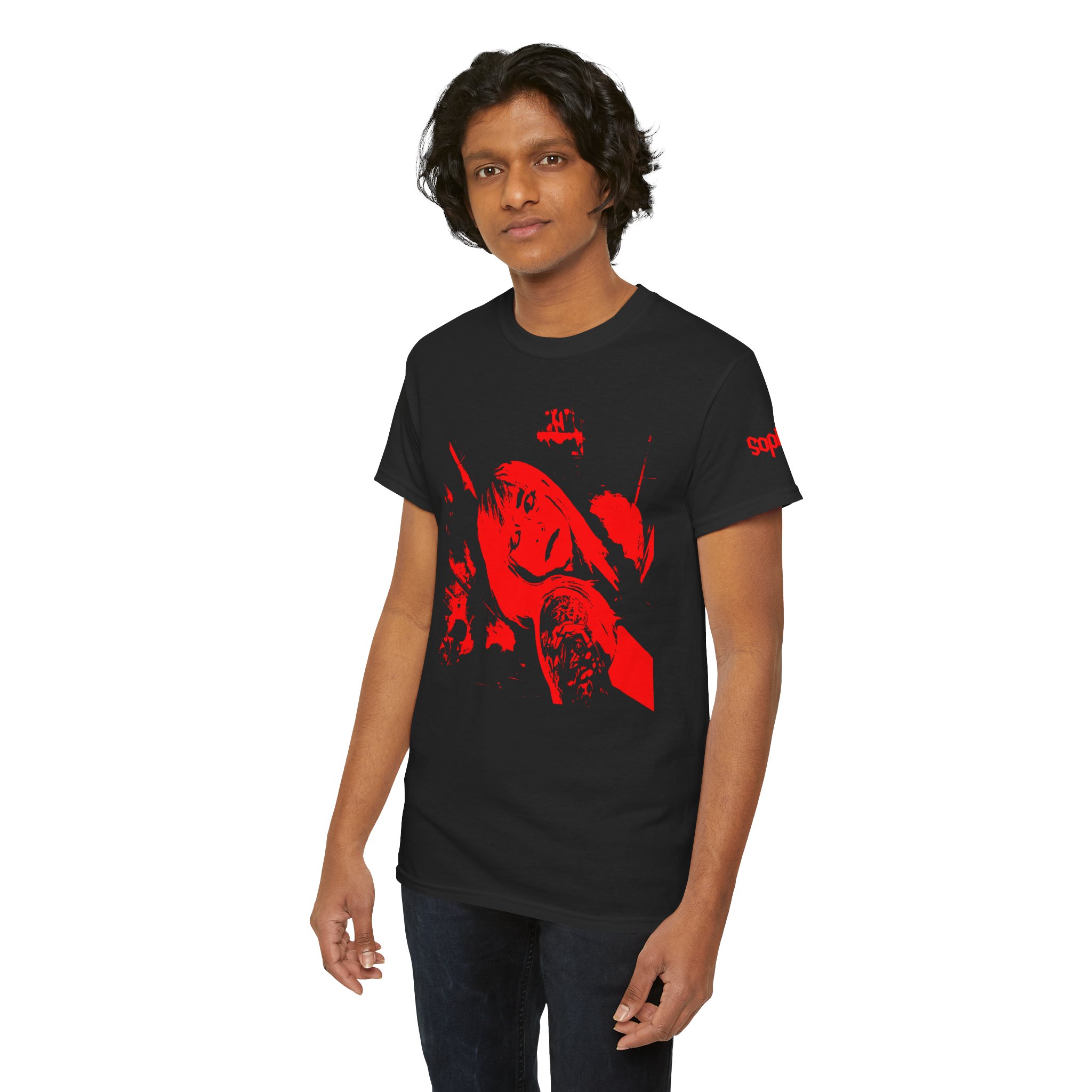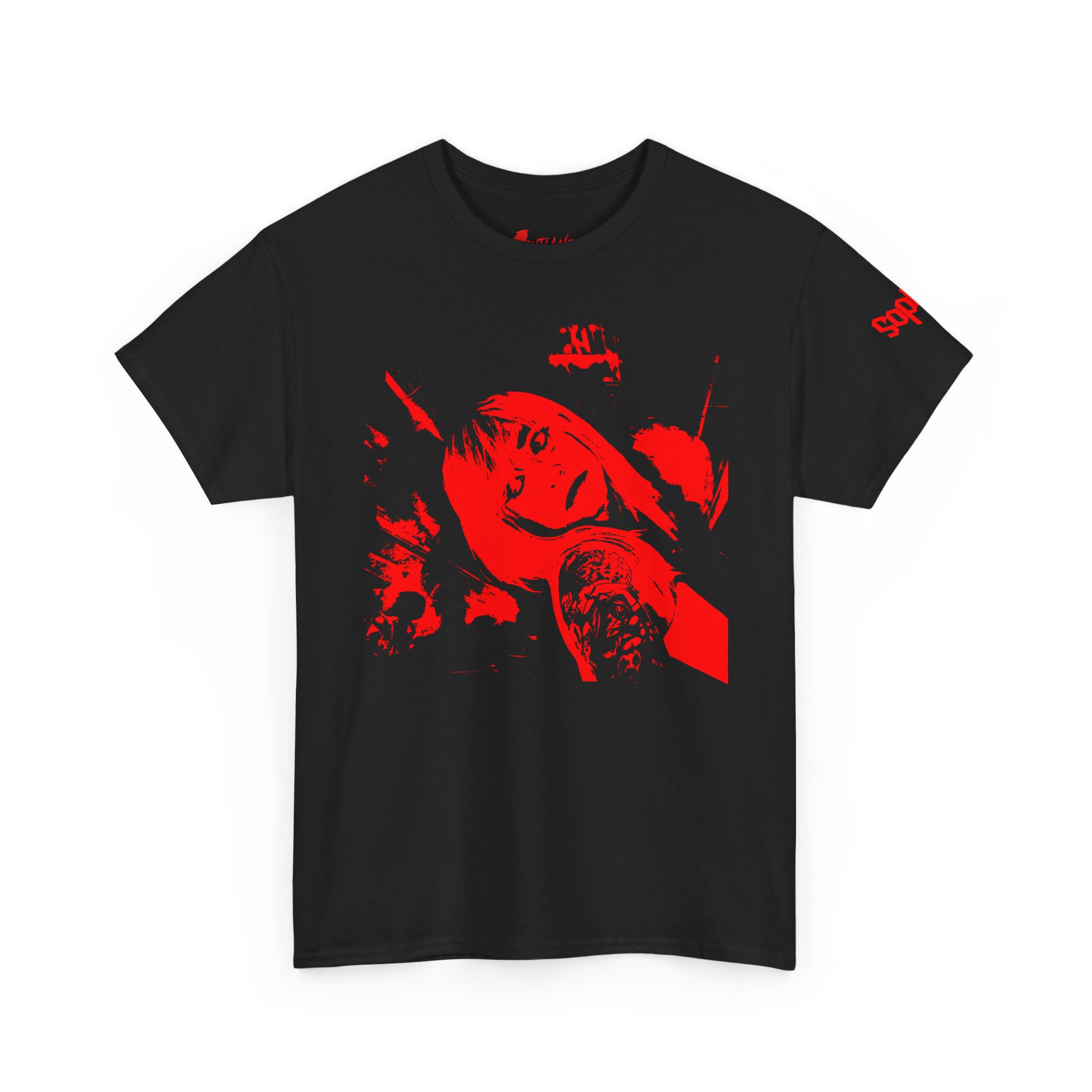 Promo design for Sophixi's first album titled "Sovereign". This high-contrast red graphic of Sophixi sits center-front with a matching accent logo on the sleeve, giving the shirt a streetwise, underground feel. Designed for the darkness of the club or the grit of a night ride, it sits easily under a leather jacket or layered with overshirts, aging into your wardrobe as a favorite go-to for concerts and gallery crawls.